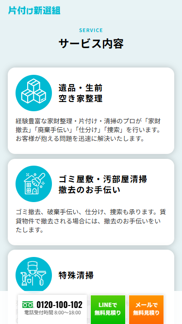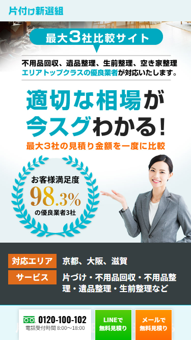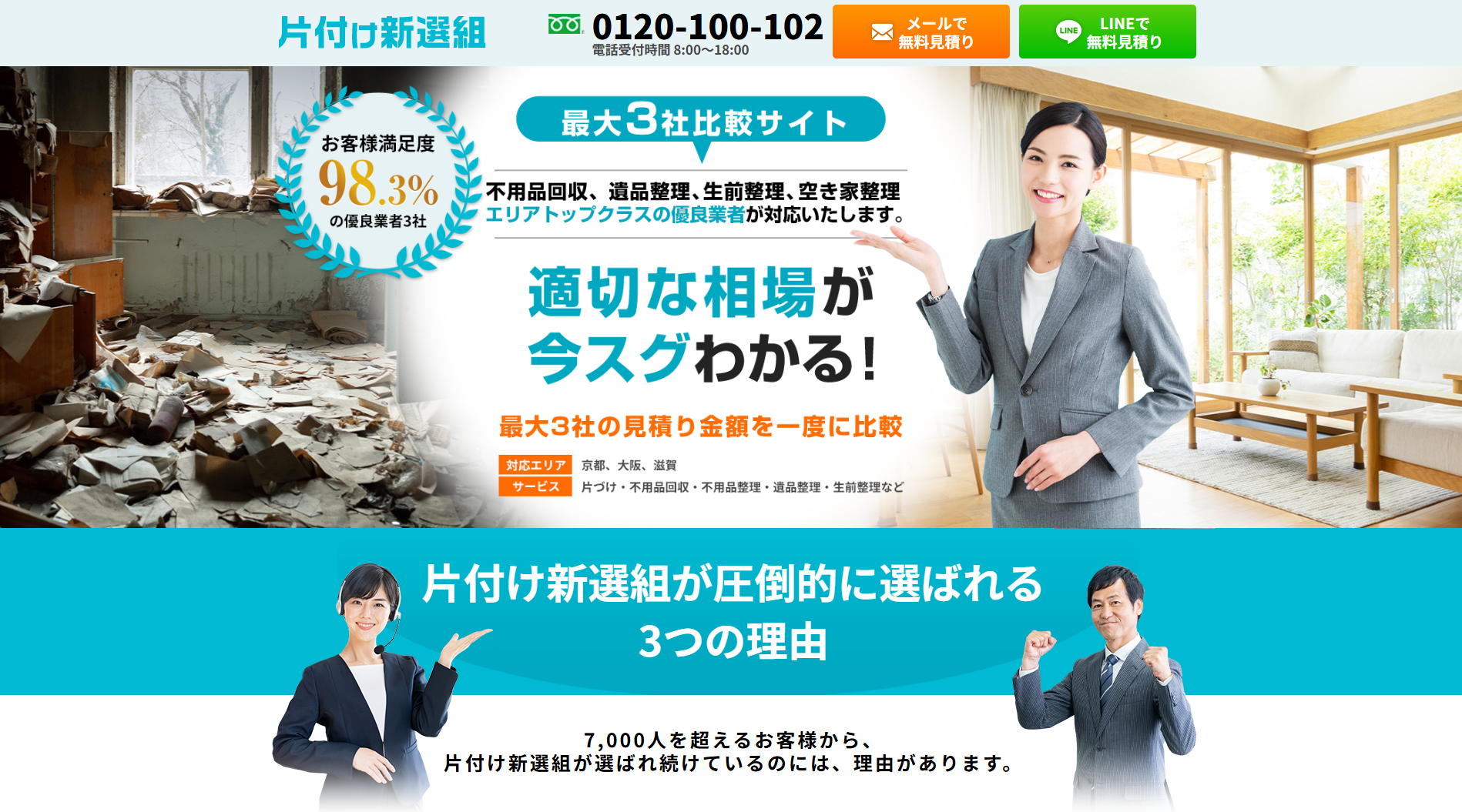 片付け新選組は、京都・大阪・滋賀エリアにおいて、遺品整理・不用品回収・空き家整理を専門に7,000件を超えるご依頼実績を誇る業者です。提携先を厳選し業界最安値水準でのサービス提供を実現し、お客様満足度98.3%(アンケート集計19〜22年)という高い評価を得ています。迅速な見積り対応と明朗な料金提示で、安心・納得の整理を実現しています。