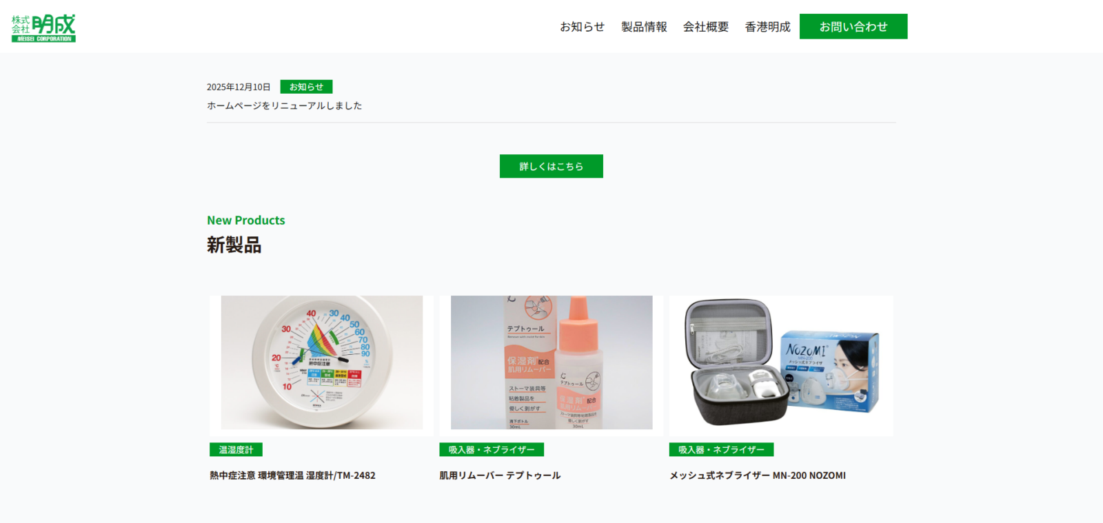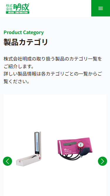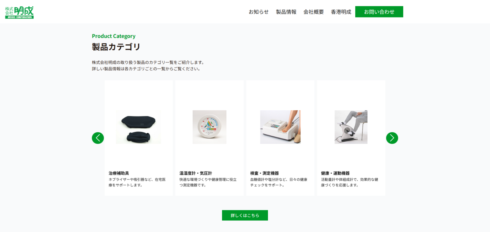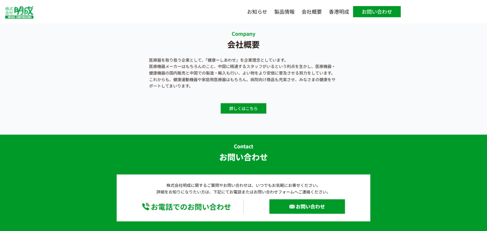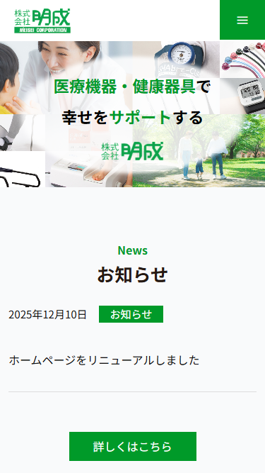 株式会社明成は、医療機器・健康機器を中心に、医療機器メーカー向け・家庭向けの機器の「輸出」「国内販売」「組立て製造」を手がけています。また、電子部品コネクタの海外販売や全自動端子圧着機の輸出にも対応。国内外のネットワークを活かし、「健康=しあわせ」の理念のもと、良質な医療機器・健康機器をより手頃に、多くの人に届ける活動を展開しています。