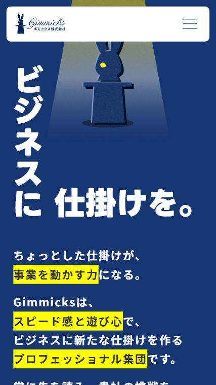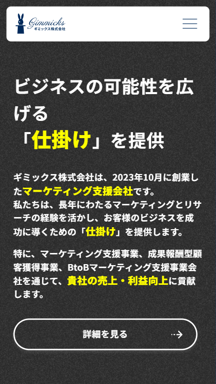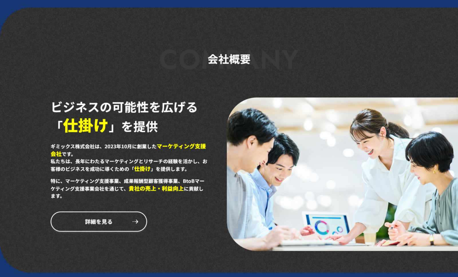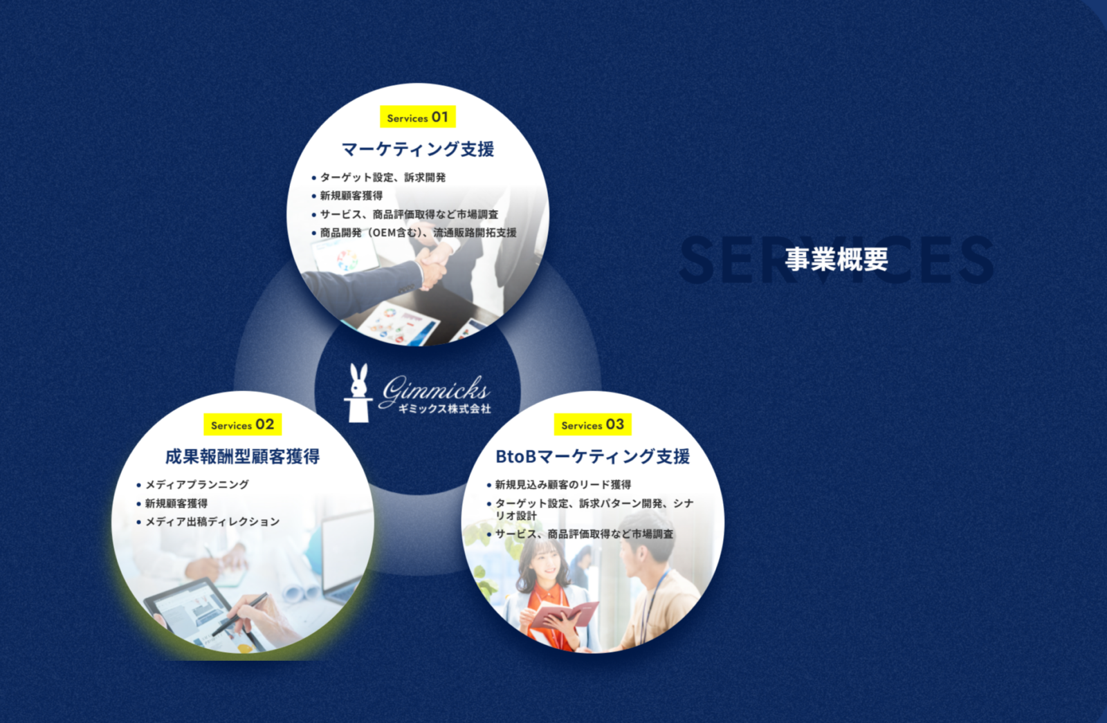 ギミックス株式会社は、マーケティング支援・BtoBリード獲得支援・メディア支援を軸に、企業の事業成長をサポートするマーケティング企業です。ターゲット設計や訴求開発、市場調査から施策実行までを一貫して支援し、「人と人とのつながり」と戦略・広告を組み合わせた独自のアプローチが特徴。スピード感と柔軟な発想で、企業の課題解決と新たな価値創出に貢献しています。
