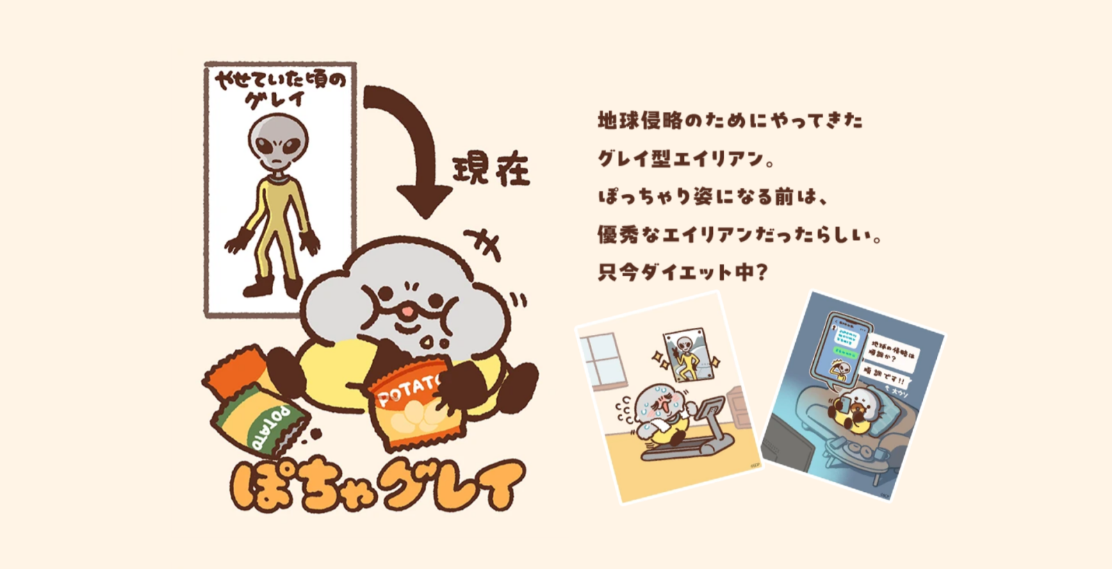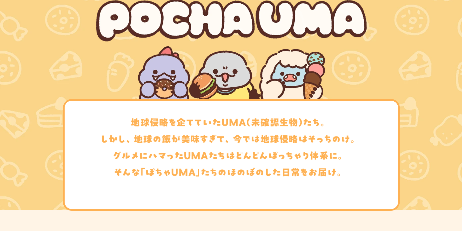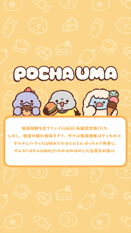 POCHA UMA(ぽちゃうま)は、地球侵略を目的にやってきた未確認生物(UMA)たちが、地球の“食”に魅了されてぽっちゃり化してしまったというユニークな設定のキャラクターコンテンツです。個性豊かなキャラクターたちの日常やストーリーを通じて、ゆるくて愛らしい世界観を発信。SNSやプロモーション展開とも連動し、親しみやすさと話題性を兼ね備えたエンタメコンテンツとして展開されています。